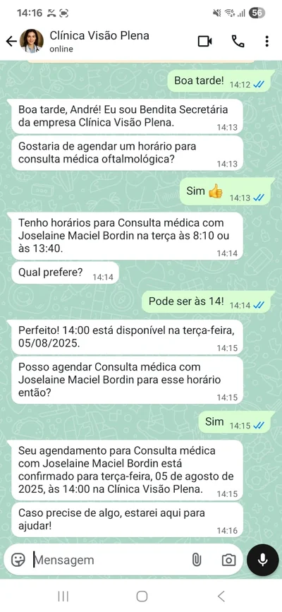 Nao e chatbot engessado. Entende audio, mensagens fracionadas, girias e responde naturalmente como secretaria real.